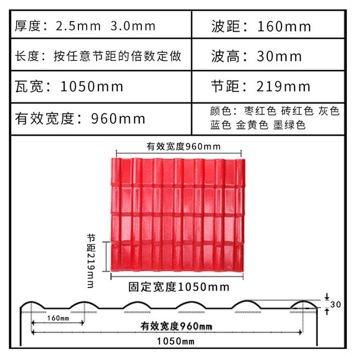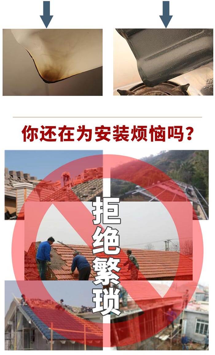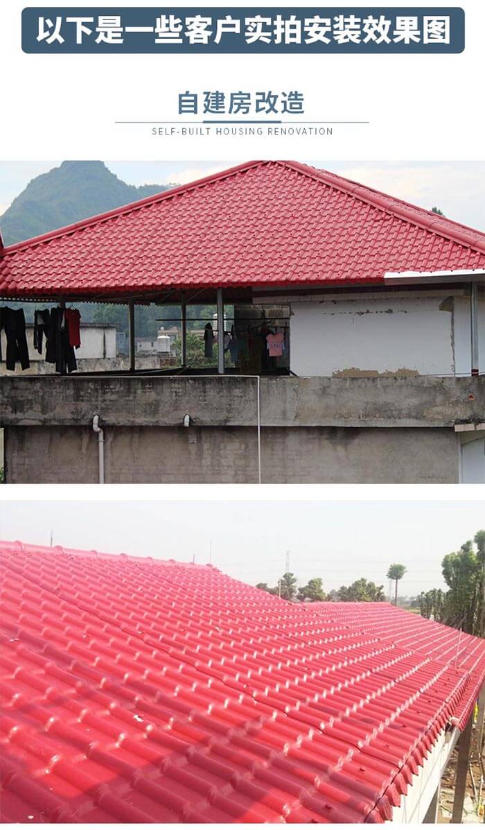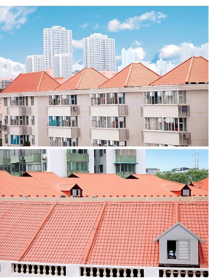 The high weatherability resin used in synthetic resin tile is compact and does not absorb water, so there is no problem of microporous water seepage. The single sheet area of synthetic resin tile is large, the roof joints are few, and the lap joint is tight, so the waterproof layer can be omitted.